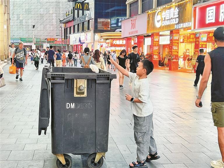 如此龐大的客流量,卻沒(méi)有讓街區(qū)變得雜亂無(wú)章,街道依舊干凈整潔。這離不開(kāi)環(huán)衛(wèi)工人的辛勤付出,王阿姨便是其中的代表。假期五天,她持續(xù)作業(yè),不僅要處理日益增多的垃圾和紙箱等廢棄物,還被調(diào)派至人流密集區(qū)域加強(qiáng)保潔力度?!白蠲Φ臅r(shí)候是下午4點(diǎn)到6點(diǎn),我們得保證垃圾不落地。”王阿姨邊清理廢棄飲料瓶邊告訴記者。
