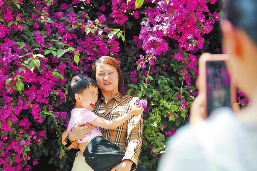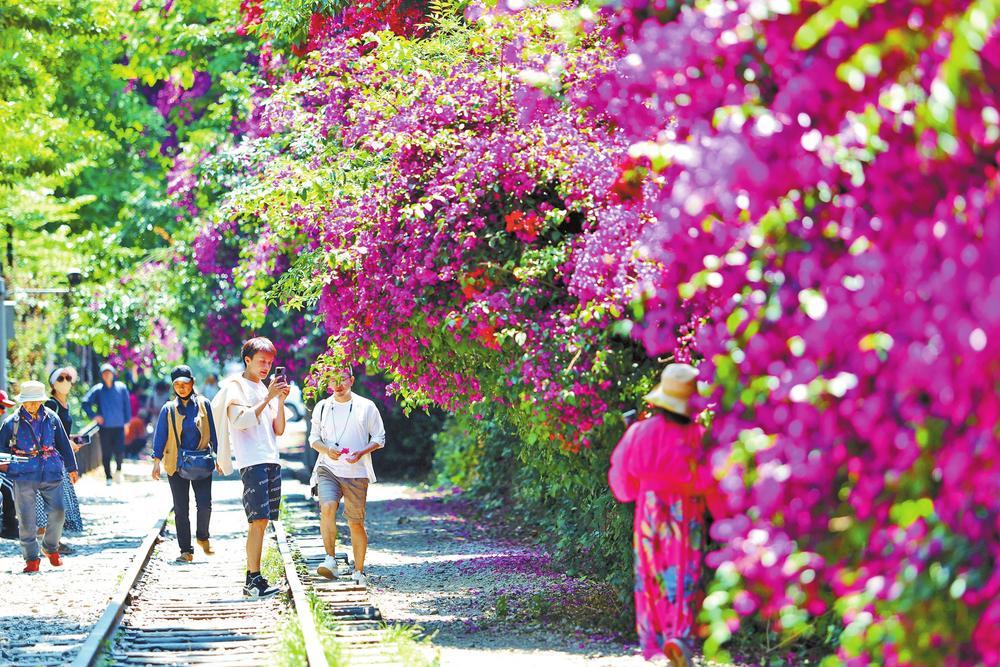 5月,昆明市五華區(qū)地臺(tái)寺鐵路兩側(cè)的三角梅絢爛綻放。在米軌鐵路旁、街巷轉(zhuǎn)角處,火紅的花瀑與周?chē)拔锵嘤吵扇?,?gòu)成了一幅充滿詩(shī)意的城市畫(huà)卷。(記者 高吳雙 攝)