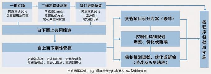 依據(jù)市級相關(guān)政策文件,結(jié)合項(xiàng)目實(shí)踐,南京秦淮區(qū)探索“自下而上多輪協(xié)商→自上而下規(guī)劃管控→修詳設(shè)計(jì)方案→控詳規(guī)劃優(yōu)化調(diào)整→初步設(shè)計(jì)→施工圖設(shè)計(jì)→建設(shè)實(shí)施→后續(xù)運(yùn)營”聯(lián)動管理機(jī)制??卦敗⑿拊斠?guī)劃承接協(xié)商意見和管控要求,指導(dǎo)、支撐城市更新實(shí)踐。