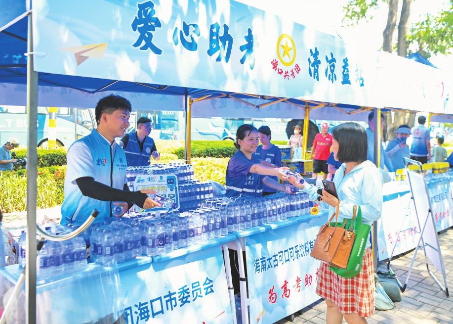 6月8日,在??诤8蹖W(xué)校考點(diǎn)外,青年志愿者為考生家長(zhǎng)送上飲用水。記者 石中華攝