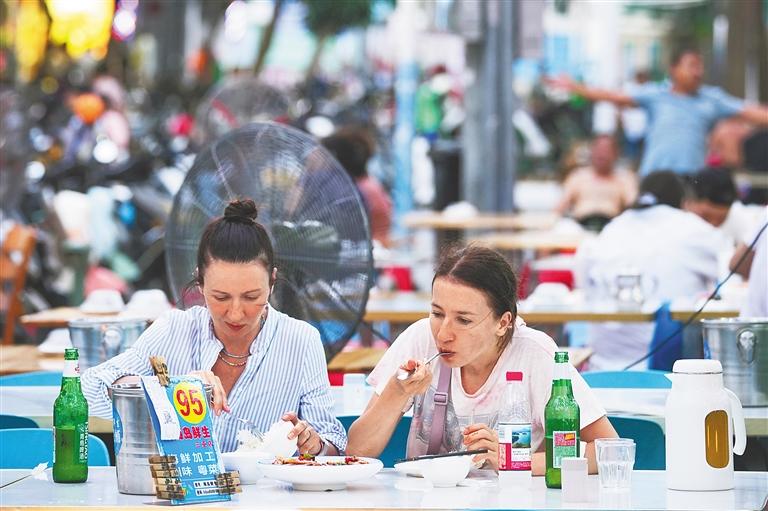 外國(guó)游客在新民街海島鮮生海鮮加工店的外擺攤位就餐。圖片均由記者王程龍攝