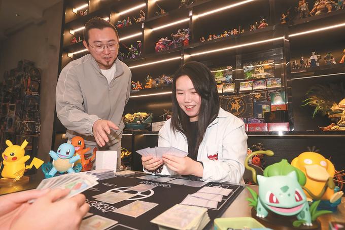 6月11日,南京市西城夜未央一家潮玩店,店主在指導客人玩卡牌游戲。小店定期組織卡牌對戰(zhàn)活動,將興趣與消費深度融合,吸引不少消費者光顧。記者 陳儼 攝