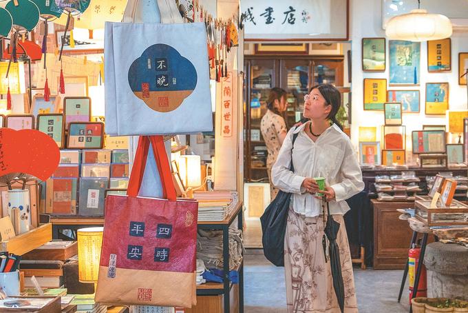 揚州皮市街的邊城書店,能買書還能體驗古籍修復,古籍拼貼畫、錦灰堆等文創(chuàng)產品更是吸引不少年輕人到此親近傳統(tǒng)文化。劉江瑞 攝 (視覺江蘇網供圖)