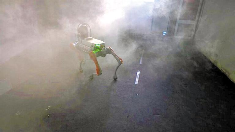 四足機器人在煙霧中開展搜救,將現(xiàn)場情況實時向指揮部進(jìn)行圖傳。深圳市消防救援支隊供圖