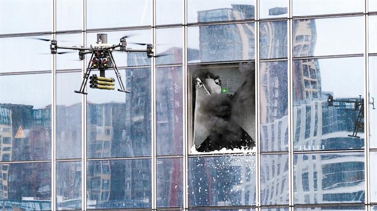 演習(xí)中,破玻無人機精準(zhǔn)發(fā)射破玻彈擊碎幕墻玻璃,開辟排煙通道。