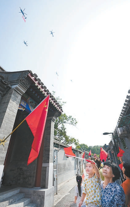 空中護(hù)旗梯隊飛過古巷上空。 記者 方非 攝