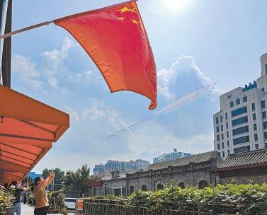 7架殲-10表演機劃出14道彩煙,市民在紅旗下打卡拍攝。喬健 攝
