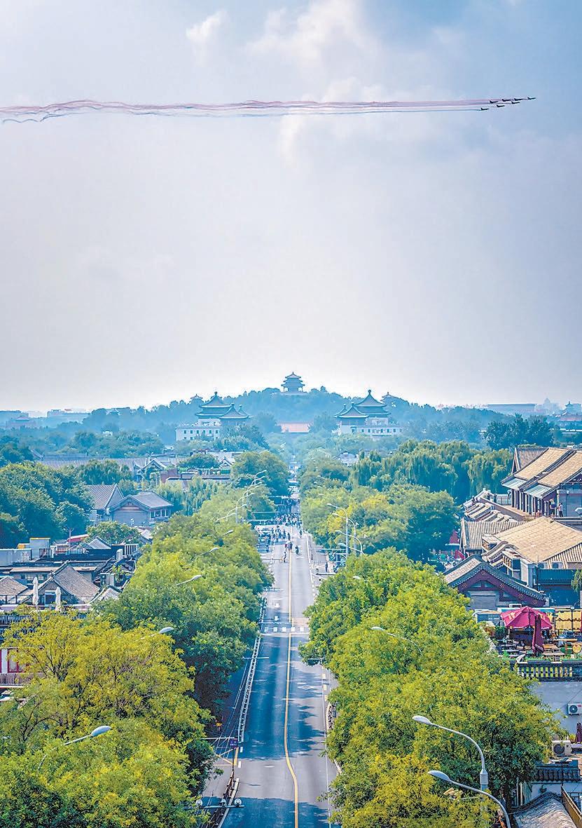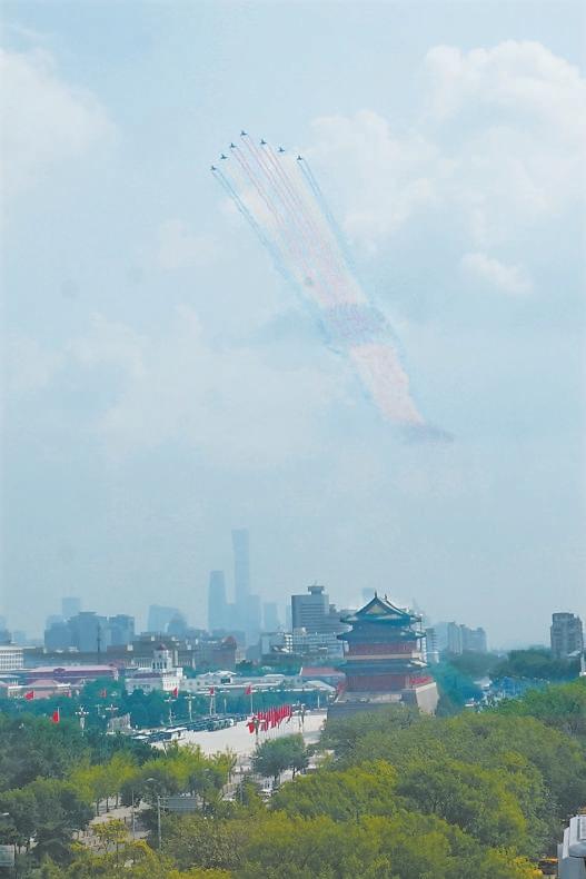戰(zhàn)機編隊拉出的彩煙與中軸線上的古都風(fēng)貌交相輝映。趙瑞 攝