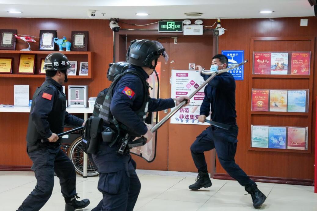 實戰(zhàn)模擬環(huán)節(jié)以“商業(yè)中心發(fā)生個人極端事件”為預(yù)設(shè)場景,全程模擬真實應(yīng)急處置流程。安保人員第一時間通過可視對講機報警,派出所指揮中心接報后,迅速開展應(yīng)急調(diào)度,指揮該商業(yè)中心的物業(yè)保安組成“最小應(yīng)急單元”,率先趕到現(xiàn)場展開先期處置。與此同時,啟動“就近互助”聯(lián)防機制——鄰近商圈、步行街的物業(yè)安保力量在接到指令后,快速攜帶裝備奔赴現(xiàn)場增援。巡特警大隊PTU則在最短時間內(nèi)抵達,以專業(yè)的戰(zhàn)術(shù)素養(yǎng)與現(xiàn)場處置力量協(xié)同配合,高效穩(wěn)妥地處置了模擬警情。派出所民警同步完成接處警后續(xù)工作,實現(xiàn)了從報警到處置完畢的全流程閉環(huán)。整個處置過程緊張有序,有效檢驗了最小應(yīng)急單元的快速反應(yīng)與協(xié)同作戰(zhàn)能力。