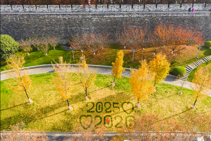 南京城墻下的銀杏葉被拼成“2025愛2026”