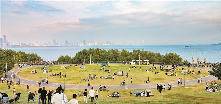 在深圳灣公園日出劇場,眾多市民陪著家人休憩游樂,共享美好假日時(shí)光。