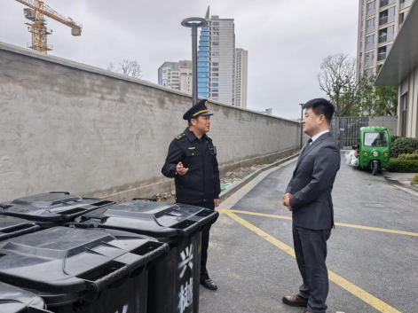 執(zhí)法人員向物業(yè)經(jīng)理講解垃圾分類要求