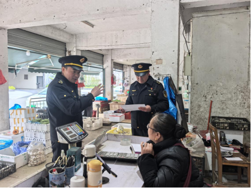 執(zhí)法人員向蔬菜店商戶普法并征集意見