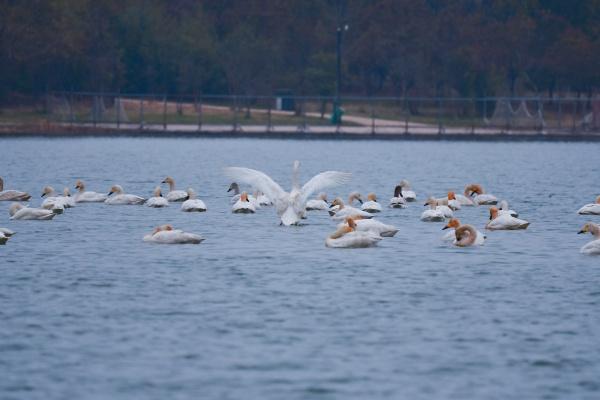 天鵝的持續(xù)到訪,已成為當(dāng)?shù)厝罕娮钇诖摹澳甓戎s”?!?021年之前也曾見過天鵝,但多為三兩只,當(dāng)時誤以為是家養(yǎng)禽類?!背砉珗@鍛煉的市民張先生感慨。家住公園附近的盧先生補充說:“此次天鵝凌晨5點多飛抵,老伴兒聽到天鵝的叫聲,便知道它們來了,我們期盼已久?!睋?jù)了解,除白天鵝外,赤麻鴨、綠頭鴨、鳳頭??等國家二級保護動物也常在此棲息,成為當(dāng)?shù)厣锒鄻有员Wo的生動寫照。