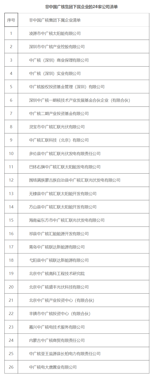 4月份,中廣核發(fā)布公告稱(chēng):凌源市中廣核太陽(yáng)能有限公司、深圳市中廣核產(chǎn)業(yè)控股有限公司、嘉興中廣核電技術(shù)服務(wù)有限公司等26家公司在企業(yè)名稱(chēng)中使用“中廣核”字樣。鑒于該26家公司并非我集團(tuán)下屬企業(yè),鄭重澄清并嚴(yán)正聲明,中國(guó)廣核集團(tuán)未擁有下述26家公司的任何資產(chǎn)或股權(quán),亦無(wú)隸屬或管理關(guān)系,并未授權(quán)下述公司使用“中廣核”商標(biāo)和字號(hào),若因下述公司的經(jīng)營(yíng)行為導(dǎo)致法律、勞務(wù)糾紛或其他相關(guān)責(zé)任,均與我集團(tuán)無(wú)關(guān)。