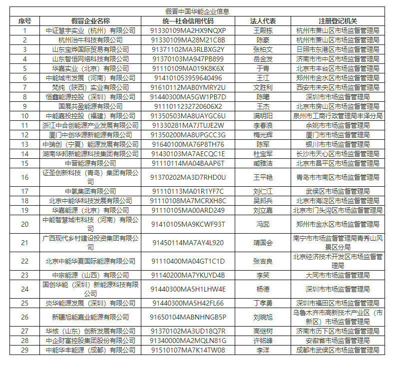 中國(guó)華能稱(chēng),發(fā)現(xiàn)不法分子通過(guò)偽造中國(guó)華能集團(tuán)有限公司(以下簡(jiǎn)稱(chēng)“中國(guó)華能”)所屬企業(yè)證照和印章,在北京、深圳、杭州、鄭州、西安等地工商系統(tǒng)中將29家企業(yè)的股東分別登記為華能(大連)能源熱力有限責(zé)任公司、華能綜合產(chǎn)業(yè)有限公司、華能海外企業(yè)管理有限公司、華能新能源股份有限公司以及天津華能楊柳青熱電實(shí)業(yè)有限公司。