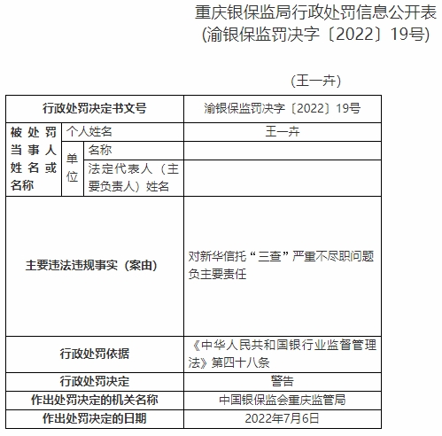 王一卉對新華信托“三查”嚴(yán)重不盡職問題負(fù)主要責(zé)任。依據(jù)《中華人民共和國銀行業(yè)監(jiān)督管理法》第四十八條,中國銀保監(jiān)會重慶監(jiān)管局對其警告。