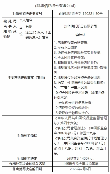 銀保監(jiān)會網(wǎng)站今日公布了重慶銀保監(jiān)局行政處罰信息公開表(渝銀保監(jiān)罰決字〔2022〕30號、16號、18號、19號、20號、21號、22號、23號、24號、25號、26號、27號、28號、29號、31號、32號)顯示,新華信托股份有限公司存在13宗主要違法違規(guī)事實(shí):未事前報(bào)告關(guān)聯(lián)交易;發(fā)放不當(dāng)激勵;通過關(guān)聯(lián)方違規(guī)開展實(shí)業(yè)投資;全面風(fēng)險(xiǎn)管理失效;超權(quán)限審批與關(guān)聯(lián)方的業(yè)務(wù);違規(guī)審批代關(guān)聯(lián)方投資造成巨額損失;違規(guī)通過關(guān)聯(lián)方資產(chǎn)虛假出表;向禁止性或限制性領(lǐng)域提供融資;“三查”嚴(yán)重不盡職;資產(chǎn)風(fēng)險(xiǎn)分類不準(zhǔn)確、減值準(zhǔn)備計(jì)提不足;未按規(guī)定進(jìn)行信息披露;信托受益權(quán)違規(guī)轉(zhuǎn)讓;委托非金融機(jī)構(gòu)推介。