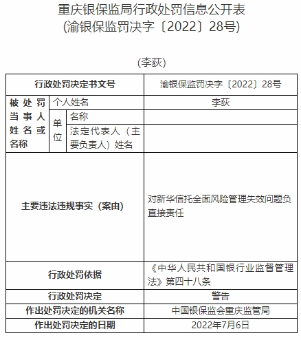 李荻對新華信托全面風(fēng)險(xiǎn)管理失效問題負(fù)直接責(zé)任。依據(jù)《中華人民共和國銀行業(yè)監(jiān)督管理法》第四十八條,中國銀保監(jiān)會重慶監(jiān)管局對其警告。