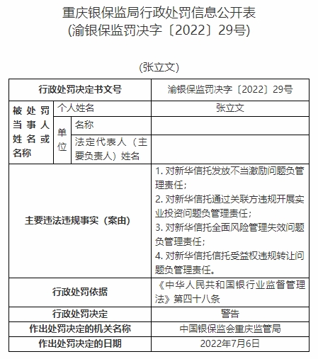 張立文對新華信托發(fā)放不當(dāng)激勵問題負(fù)管理責(zé)任、對新華信托通過關(guān)聯(lián)方違規(guī)開展實(shí)業(yè)投資問題負(fù)管理責(zé)任、對新華信托全面風(fēng)險(xiǎn)管理失效問題負(fù)管理責(zé)任、對新華信托信托受益權(quán)違規(guī)轉(zhuǎn)讓問題負(fù)管理責(zé)任。依據(jù)《中華人民共和國銀行業(yè)監(jiān)督管理法》第四十八條,中國銀保監(jiān)會重慶監(jiān)管局對其警告。