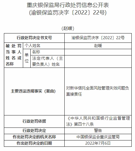 趙暖對新華信托全面風(fēng)險(xiǎn)管理失效問題負(fù)直接責(zé)任。依據(jù)《中華人民共和國銀行業(yè)監(jiān)督管理法》第四十八條,中國銀保監(jiān)會重慶監(jiān)管局對其警告。