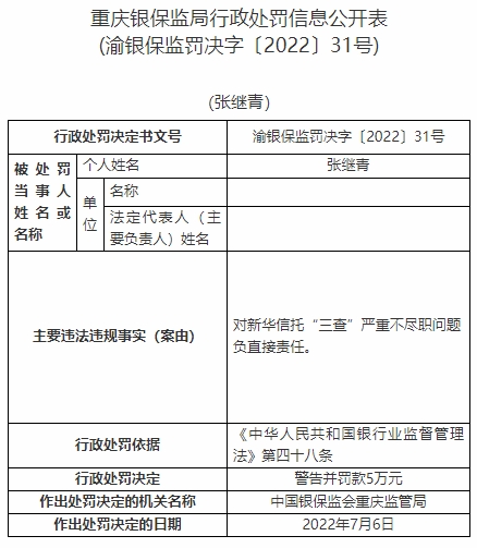 張繼青對新華信托“三查”嚴(yán)重不盡職問題負(fù)直接責(zé)任。依據(jù)《中華人民共和國銀行業(yè)監(jiān)督管理法》第四十八條,中國銀保監(jiān)會重慶監(jiān)管局對其警告并罰款5萬元。