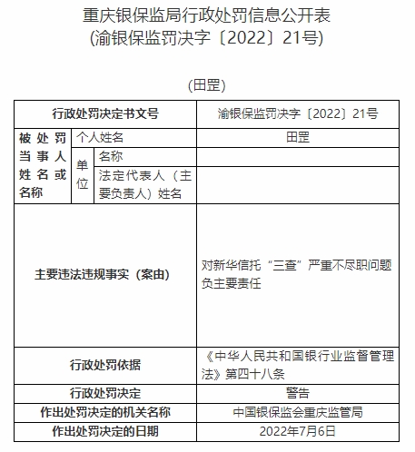 田罡對新華信托“三查”嚴(yán)重不盡職問題負(fù)主要責(zé)任。依據(jù)《中華人民共和國銀行業(yè)監(jiān)督管理法》第四十八條,中國銀保監(jiān)會重慶監(jiān)管局對其警告。