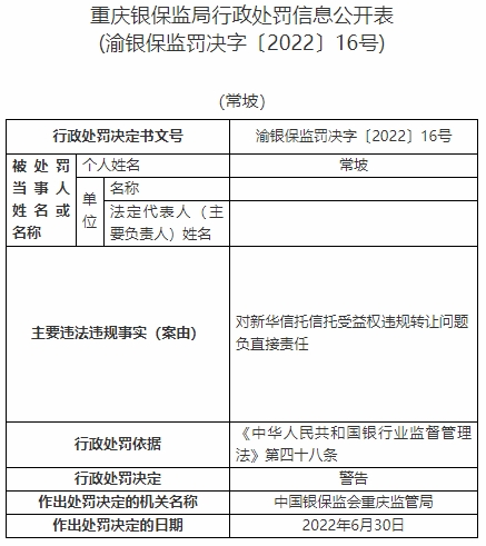 常坡對新華信托信托受益權(quán)違規(guī)轉(zhuǎn)讓問題負(fù)直接責(zé)任。依據(jù)《中華人民共和國銀行業(yè)監(jiān)督管理法》第四十八條,中國銀保監(jiān)會重慶監(jiān)管局對其警告。