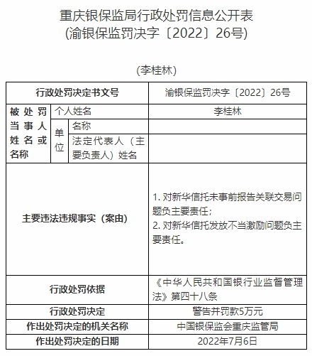 李桂林對新華信托未事前報(bào)告關(guān)聯(lián)交易問題負(fù)主要責(zé)任、對新華信托發(fā)放不當(dāng)激勵問題負(fù)主要責(zé)任。依據(jù)《中華人民共和國銀行業(yè)監(jiān)督管理法》第四十八條,中國銀保監(jiān)會重慶監(jiān)管局對其警告并罰款5萬元。