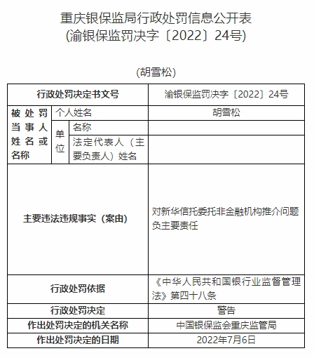 胡雪松對新華信托委托非金融機(jī)構(gòu)推介問題負(fù)主要責(zé)任。依據(jù)《中華人民共和國銀行業(yè)監(jiān)督管理法》第四十八條,中國銀保監(jiān)會重慶監(jiān)管局對其警告。