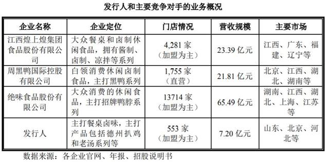 在招股書中,德州扒雞將休閑鹵制品企業(yè)煌上煌、周黑鴨、絕味食品列為行業(yè)內(nèi)主要競(jìng)爭(zhēng)對(duì)手。需要注意的是,不論是營收規(guī)模還是門店數(shù)量,德州扒雞都遠(yuǎn)不及這些競(jìng)爭(zhēng)對(duì)手。