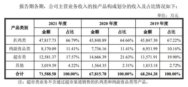 招股書顯示,德州扒雞目前主要從事以扒雞產(chǎn)品為主,其他肉熟食為輔的鹵制食品研發(fā)、生產(chǎn)和銷售及山東省德州市內(nèi)的食品超市經(jīng)營業(yè)務(wù)。2019年至2021年,該公司分別實(shí)現(xiàn)營業(yè)收入6.87億元、6.82億元、7.20億元;歸母凈利潤1.22億元、9455.92萬元、1.20億元。