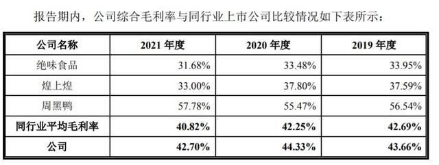 不過,德州扒雞的毛利率在行業(yè)內(nèi)處于較高水平。招股書顯示,2019年至2021年,德州扒雞綜合毛利率分別為 43.66%、44.33%、42.70%,低于周黑鴨,高于絕味食品和煌上煌。其中2021年,煌上煌、周黑鴨、絕味食品的毛利率分別為33.00%、57.78%、31.68%。