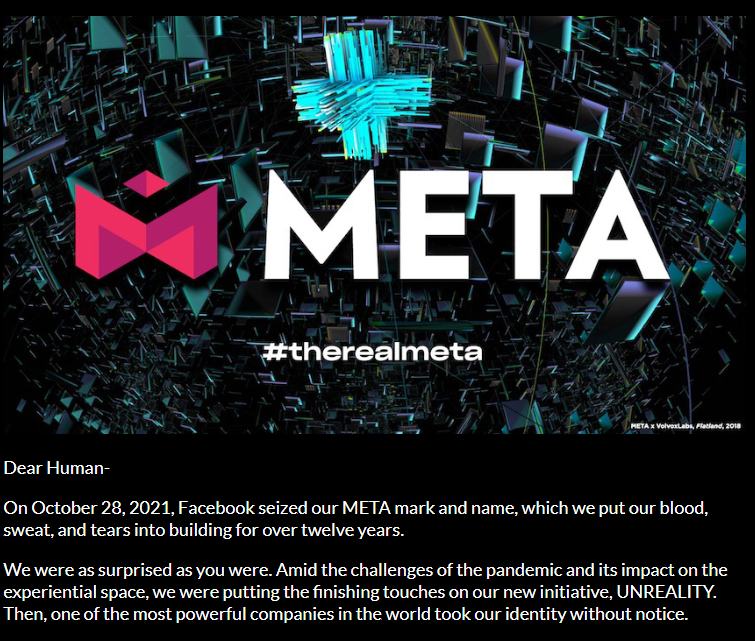 同時,小Meta的CEO還發(fā)表博客文章控訴道:“2021年10月28日,F(xiàn)acebook獲得了我們的META標志和名稱,這是我們十二年來用自己的血、汗和眼淚建立起來的。我們和你們一樣驚訝……世界上最強大的公司之一在未告知的情況下奪走了我們的身份。”