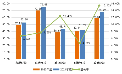 從五個一級指標(biāo)來看,各參評城市市場環(huán)境、法治環(huán)境、融資環(huán)境、創(chuàng)新環(huán)境和政策環(huán)境整體均有所改善,得分均值分別為52.80、75.68、43.71、41.95和68.49,分別比上次評估增長6.65%、7.65%、12.40%、4.52%和15.42%。