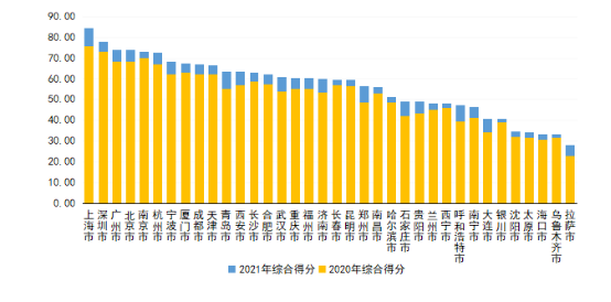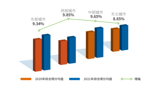 評估顯示,2021年度各參評城市綜合得分均值為56.53,比上次評估得分均值(51.63)增長9.49%。所有參評城市綜合得分較上次均有所提升,超過5%的城市有33個,占比達(dá)91.67%;超過10%的城市有12個,占比達(dá)33.33%。