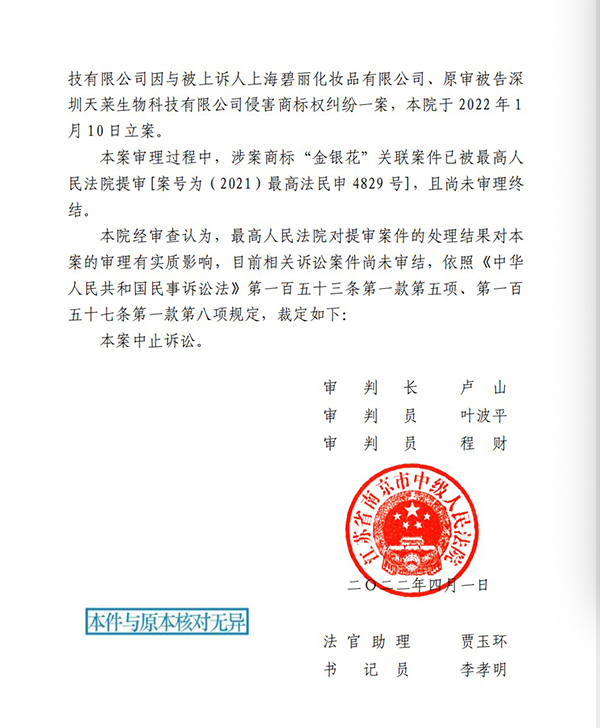 如4月1日,江蘇南京中院基于“金銀花”關聯(lián)案件已被最高法提審,決定中止審理上訴人南京三盾藥業(yè)有限公司、青島海氏海諾英諾威消毒科技有限公司與被上訴人上海碧麗化妝品有限公司案。“最高人民法院對提審案件的處理結果對本案的審理有實質影響,目前相關訴訟案件尚未審結,依法裁定本案中止訴訟?!辈枚〞Q。