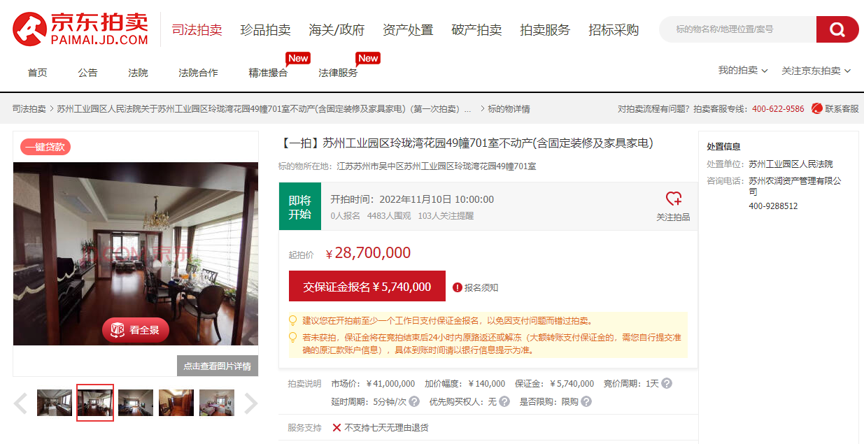 說起玲瓏灣,稍微了解蘇州房市的人都清楚,這里一直是蘇州普通住宅單價的天花板。該小區(qū)位于蘇州工業(yè)園區(qū),得天獨(dú)厚的地理位置,可以把金雞湖的湖景盡收眼底,經(jīng)常出現(xiàn)在國內(nèi)影視劇中,可謂是園區(qū)的明星樓盤。本次蘇州法拍節(jié)期間開拍的一套約300平米的大平層,裝修奢華,站在陽臺即可飽覽金雞湖美景,市場評估價4100萬元,將在11月10日以2870萬元進(jìn)行拍賣。