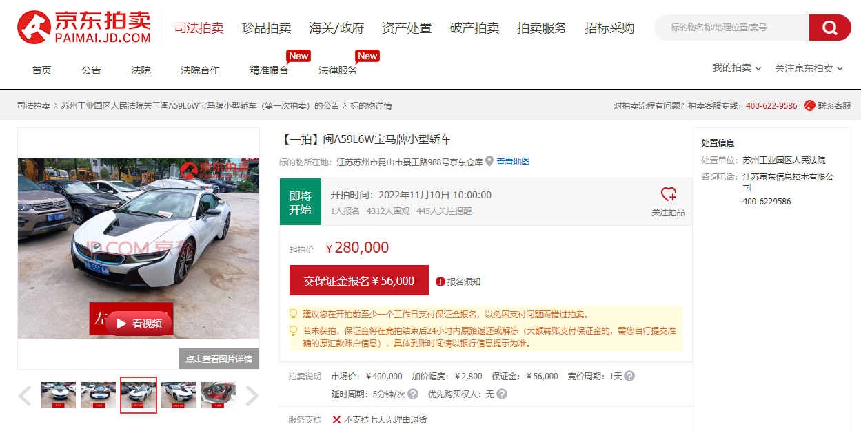 由蘇州工業(yè)園區(qū)法院處置的一臺2015年掛牌的寶馬i8,行駛里程約8萬公里,起拍價僅28萬元。寶馬i8在當(dāng)年上市之初,號稱是唯一量產(chǎn)的概念車型,要重新定義城市移動出行方式,其超酷炫的外觀設(shè)計仿佛從未來穿越而來,博得一眾車友的喜愛。據(jù)了解,該臺車因融資租賃糾紛被法院查封拍賣,已吸引了4300余人的圍觀,花落誰家讓人期待。