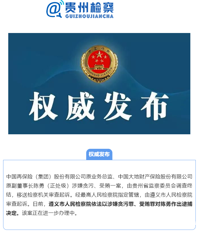 11月30日,貴州省人民檢察院通報(bào),中國(guó)再保險(xiǎn)(集團(tuán))股份有限公司原業(yè)務(wù)總監(jiān)、中國(guó)大地財(cái)產(chǎn)保險(xiǎn)股份有限公司原副董事長(zhǎng)陳勇(正處級(jí))涉嫌貪污、受賄一案,由貴州省監(jiān)察委員會(huì)調(diào)查終結(jié),移送檢察機(jī)關(guān)審查起訴。