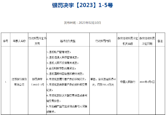 針對(duì)上述違法行為,中國人民銀行對(duì)江蘇銀行處以警告,沒收違法所得42元,并罰款773.6萬元。行政處罰決定日期為2023年2月6日。