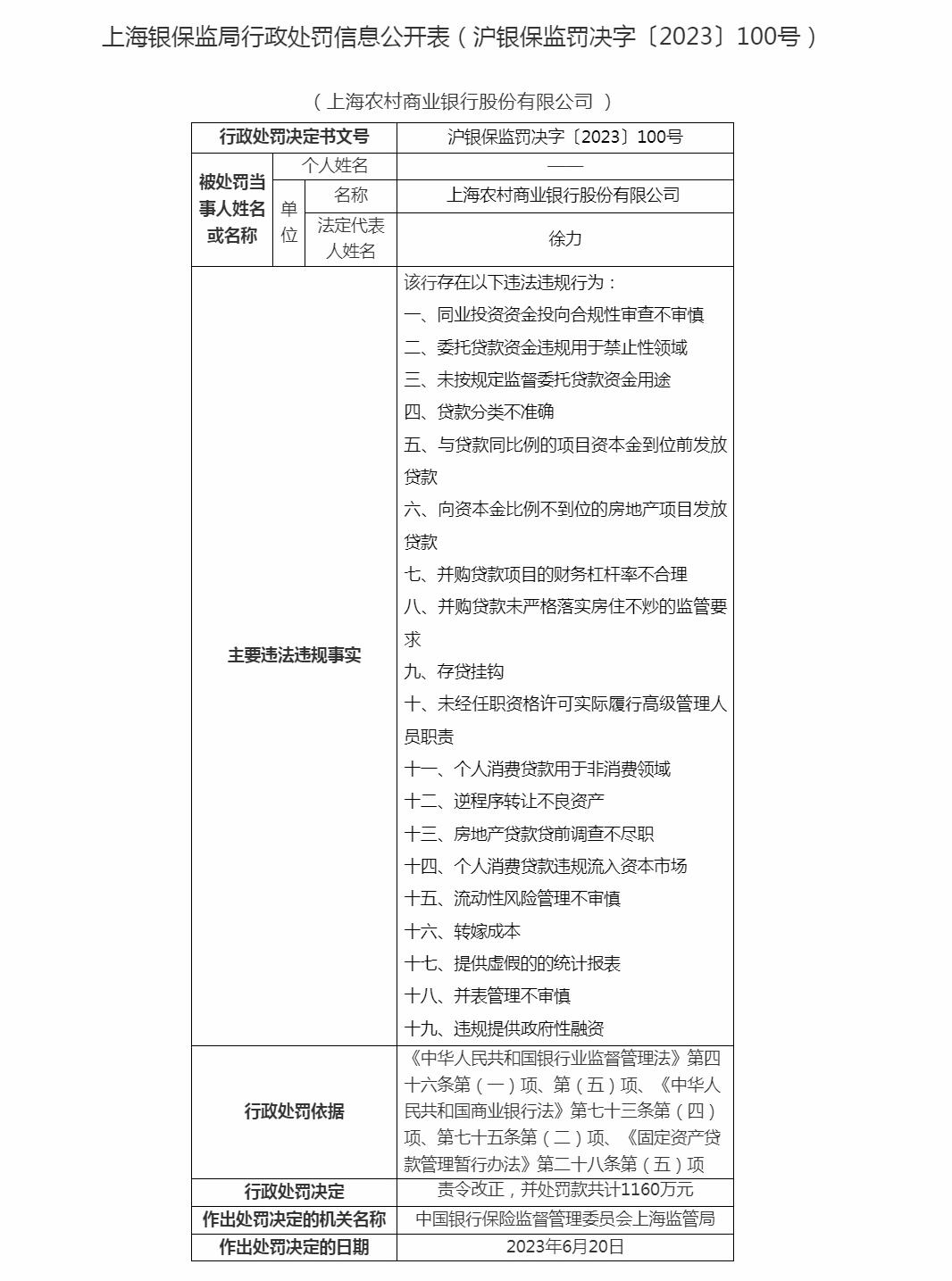 對此,上海銀保監(jiān)局依據《中華人民共和國銀行業(yè)監(jiān)督管理法》第四十六條第(一)項、第(五)項、《中華人民共和國商業(yè)銀行法》第七十三條第(四)項、第七十五條第(二)項、《固定資產貸款管理暫行辦法》第二十八條第(五)項的規(guī)定,對上海農商銀行作出責令改正,并處罰款共計1160萬元。作出行政處罰決定日期為2023年6月20日。