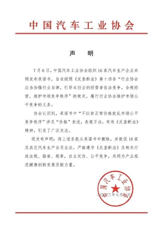中國汽車工業(yè)協(xié)會(huì)表示,現(xiàn)發(fā)布聲明:將上述條款從承諾書中刪除,并敦促16家及其它汽車生產(chǎn)會(huì)員企業(yè),嚴(yán)格遵守《反壟斷法》及相關(guān)行政法規(guī)、指南、規(guī)章,自主定價(jià)、公平競爭,共同為產(chǎn)業(yè)規(guī)范健康創(chuàng)新發(fā)展貢獻(xiàn)力量。