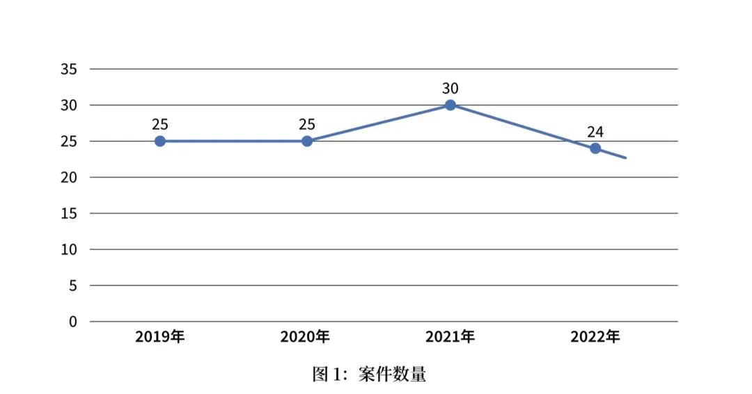 我院于2019年1月1日至2022年12月31日審結的涉股東出資責任案件,去除管轄、財保、指令審理,有效案件共計104件,包括一審案件3件,二審案件100件,再審案件1件。從結案年份來看,2019年為25件,2020年為25件,2021年為30件,2022年為24件。2019年至2021年逐年增加,2021年出現(xiàn)峰值,受新冠疫情等因素影響,2022年結案數(shù)量有所回落。從以上數(shù)字可見,我院審結的涉股東出資責任案件數(shù)量總體呈平穩(wěn)上升趨勢。(如圖1)