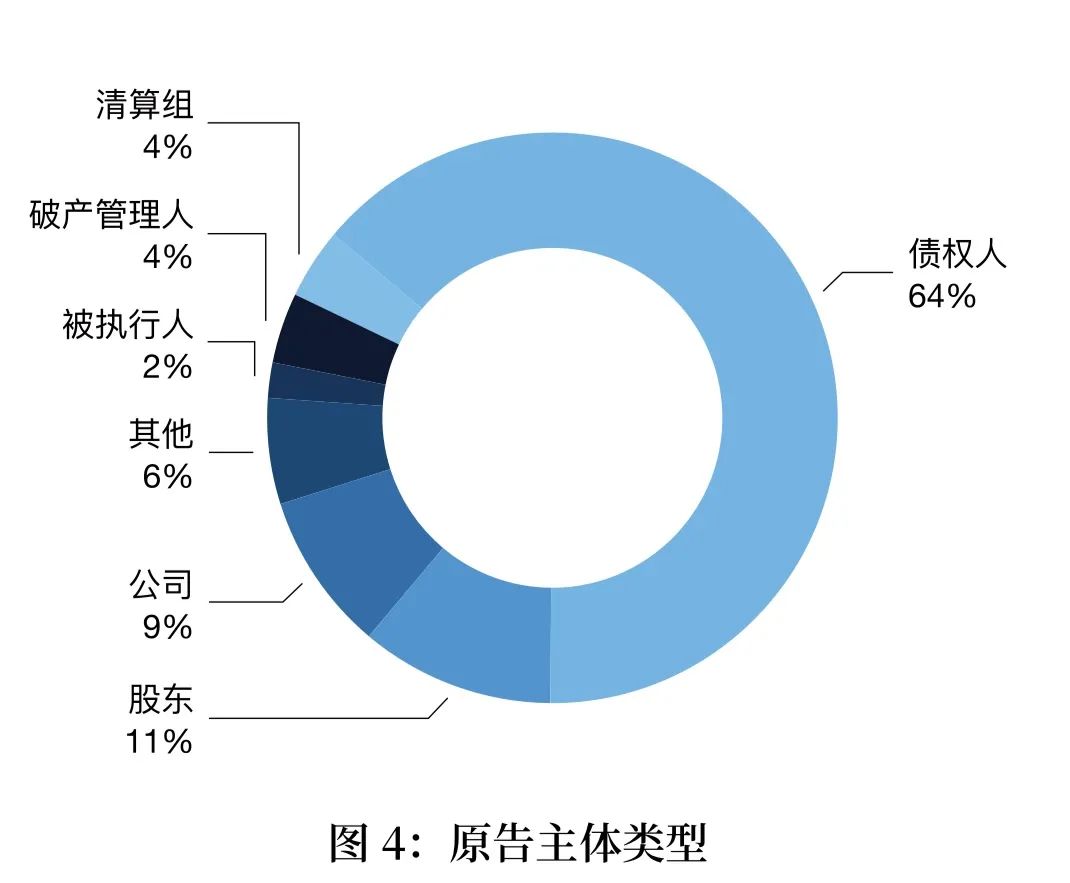 我院近四年審理的涉股東出資責任案件中,原告的主體范圍包括公司、股東、債權人、清算組、破產(chǎn)管理人、被執(zhí)行人等,其中債權人作為原告的案件數(shù)量占比64%,是要求股東承擔出資責任的主要群體,占據(jù)絕對多數(shù)。被告的主體范圍包括公司、違反出資義務的股東、受讓股東、出資未屆期的股東、協(xié)助抽逃出資董事、高級管理人員、瑕疵股權的受讓人等,其中違反出資義務的股東與出資未屆期的股東作為被告的案件數(shù)量占比56%,也超過了半數(shù)。綜合原被告的主體范圍數(shù)據(jù),可以發(fā)現(xiàn)我院近四年審理的涉股東出資責任案件中,大部分系債權人要求違反出資義務的股東與出資未屆期的股東承擔出資責任的案件。(如圖4、圖5)