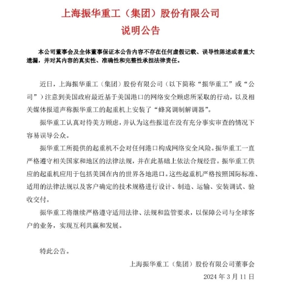3月10日晚間,振華重工發(fā)布公告稱,公司注意到美國(guó)政府最近基于對(duì)美國(guó)港口的網(wǎng)絡(luò)安全顧慮所采取的行動(dòng),以及相關(guān)媒體報(bào)道稱振華重工的起重機(jī)上安裝了“蜂窩調(diào)制解調(diào)器”。公司強(qiáng)調(diào),其所提供的起重機(jī)不會(huì)對(duì)任何港口構(gòu)成網(wǎng)絡(luò)安全風(fēng)險(xiǎn)。公司一直嚴(yán)格遵守相關(guān)國(guó)家和地區(qū)的法律法規(guī),并在此基礎(chǔ)上依法合規(guī)經(jīng)營(yíng)。