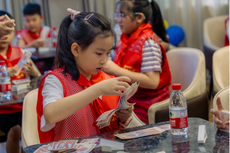 在“點(diǎn)鈔大PK”環(huán)節(jié),支行員工向同學(xué)們展示了不同的專業(yè)點(diǎn)鈔手法,并手把手地教授規(guī)范的點(diǎn)鈔動作。孩子們摩拳擦掌、躍躍欲試。隨著一聲令下“開始”,孩子們很快進(jìn)入了狀態(tài),緊張的呼吸聲伴隨著練功券翻動的聲音,此刻他們仿佛真的成為了“小小銀行家”。