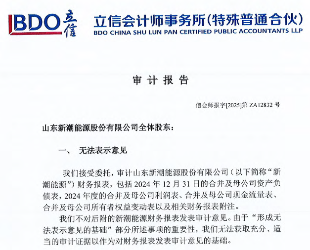 值得關(guān)注的是,因未能按時(shí)披露定期報(bào)告,*ST新潮股票自5月6日起停牌,并引發(fā)證監(jiān)會(huì)立案調(diào)查。在經(jīng)歷數(shù)月的加急審計(jì)后,立信會(huì)計(jì)師事務(wù)所7月5日完成了ST新潮2024年年報(bào)及2025年一季報(bào)的審計(jì)。然而,立信對財(cái)務(wù)報(bào)告和內(nèi)部控制均出具了“無法表示意見”的審計(jì)結(jié)論。