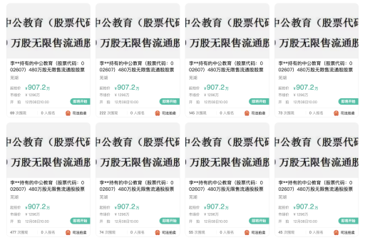 阿里資產(chǎn)司法平臺顯示,上述4800萬股股份被分為10個標的,每一個標的物“李**持有的中公教育(股票代碼:002607)480萬股無限售流通股股票”的起拍價為907.2萬元。