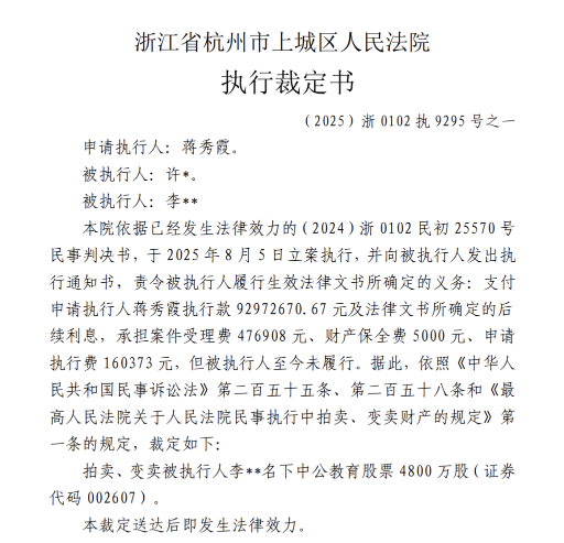 根據(jù)司法拍賣平臺披露的浙江省杭州市上城區(qū)人民法院執(zhí)行裁定書,法院依據(jù)已經(jīng)發(fā)生法律效力的(2024)浙0102民初25570號民事判決書,于2025年8月5日立案執(zhí)行,并向被執(zhí)行人發(fā)出執(zhí)行通知書,責令被執(zhí)行人履行生效法律文書所確定的義務:支付申請執(zhí)行人蔣秀霞執(zhí)行款92972670.67元及法律文書所確定的后續(xù)利息,承擔案件受理費476908元、財產(chǎn)保全費5000元、申請執(zhí)行費160373元,但被執(zhí)行人至今未履行。據(jù)此,依照《中華人民共和國民事訴訟法》第二百五十五條、第二百五十八條和《最高人民法院關于人民法院民事執(zhí)行中拍賣、變賣財產(chǎn)的規(guī)定》第一條的規(guī)定,裁定拍賣、變賣被執(zhí)行人名下中公教育股票4800萬股(證券代碼002607)。